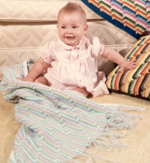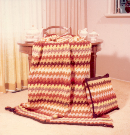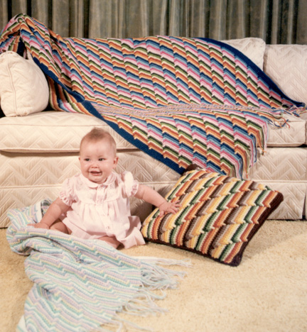 Rainbow of Tier Drops Afghan, Baby Afghan and Pillow.  Design forms an optical illusion; it's very easy to do in just sc and dropped dc st.  Make it in rainbow colors as shown on large afghan, in earth tones as shown on pillow, or in pastel baby shades as shown on baby afghan.  Great for leftover scraps of yarn.  It takes about 15 yds. of yarn for each large afghan row.  Sizes include 64 1/2" x 41" afghan, 32" x 38" baby afghan and 14" square pillow.  Instructions are also included for changing the size of your afghan.
