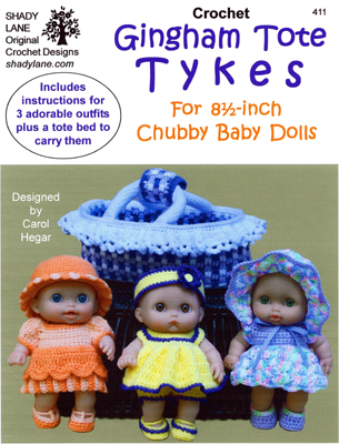 I love designing doll clothes, and here are a few I want to show you.  I had been wanting to do a tote bed with some little doll outfits for quite a while, and finally got around to them with the Gingham Tote Tykes.  My mind was geared to making a gift for a little one with a carryall to put them in.  At Walmart I found the Berenguer Lil Cutesies 8.5" dolls for my granddaughter who was 4 at the time, and she just loved them.  Then her sister, who was about 9, "casually" mentioned that she sure did like those little dolls (hint, hint)....so of course grandma had to get her some too!  I made everything out of baby yarn with one outfit trimmed in size 10 thread for a delicate look.