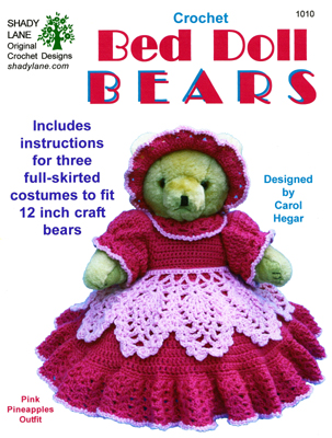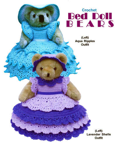 Another thing on my "list" to do was some full skirted bed doll outfits for the 12" craft bear you see in stores...I believe they are made by Fibrecraft and Darice.  For those more into animals than dolls, I thought this would be a nice change of pace.  The outfits are made out of baby or sport yarn, and I included a pattern for a worsted weight pillow form to go underneath, or you can leave that out and just have the full skirt laying on the bed.  I had a fun time figuring out how to do the hats with holes for the ears!  But I finally got it!