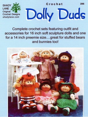 Dolly Duds is a vintage pattern set from the 1980's that I have reissued in electronic form (the pattern book is long since it has 6 outfits plus accessories like shoes and hats included!).  It was designed for popular Cabbage Patch Kids, or soft sculptured dolls around 16" in length.  I've heard that these CPK outfits will work for chubby baby dolls as well...I'm thinking particularly of the Bitty Baby Dolls put out by the American Girl Doll Company.  In fact I think another designer told me she had modeled some of her Bitty Baby outfits on a Cabbage Patch doll.